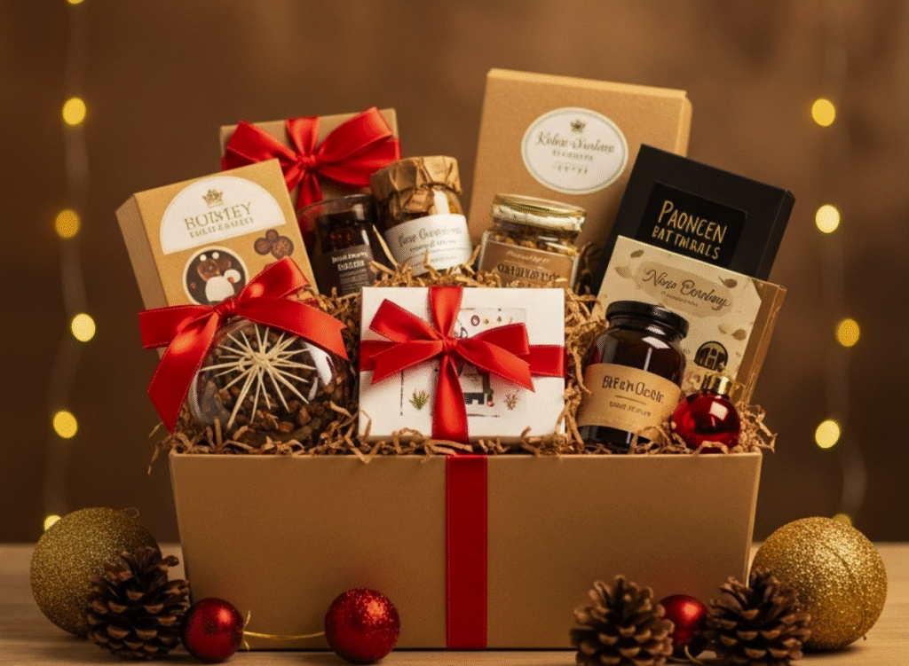 - Wellness hampers with teas, candles, and stress-relief items.